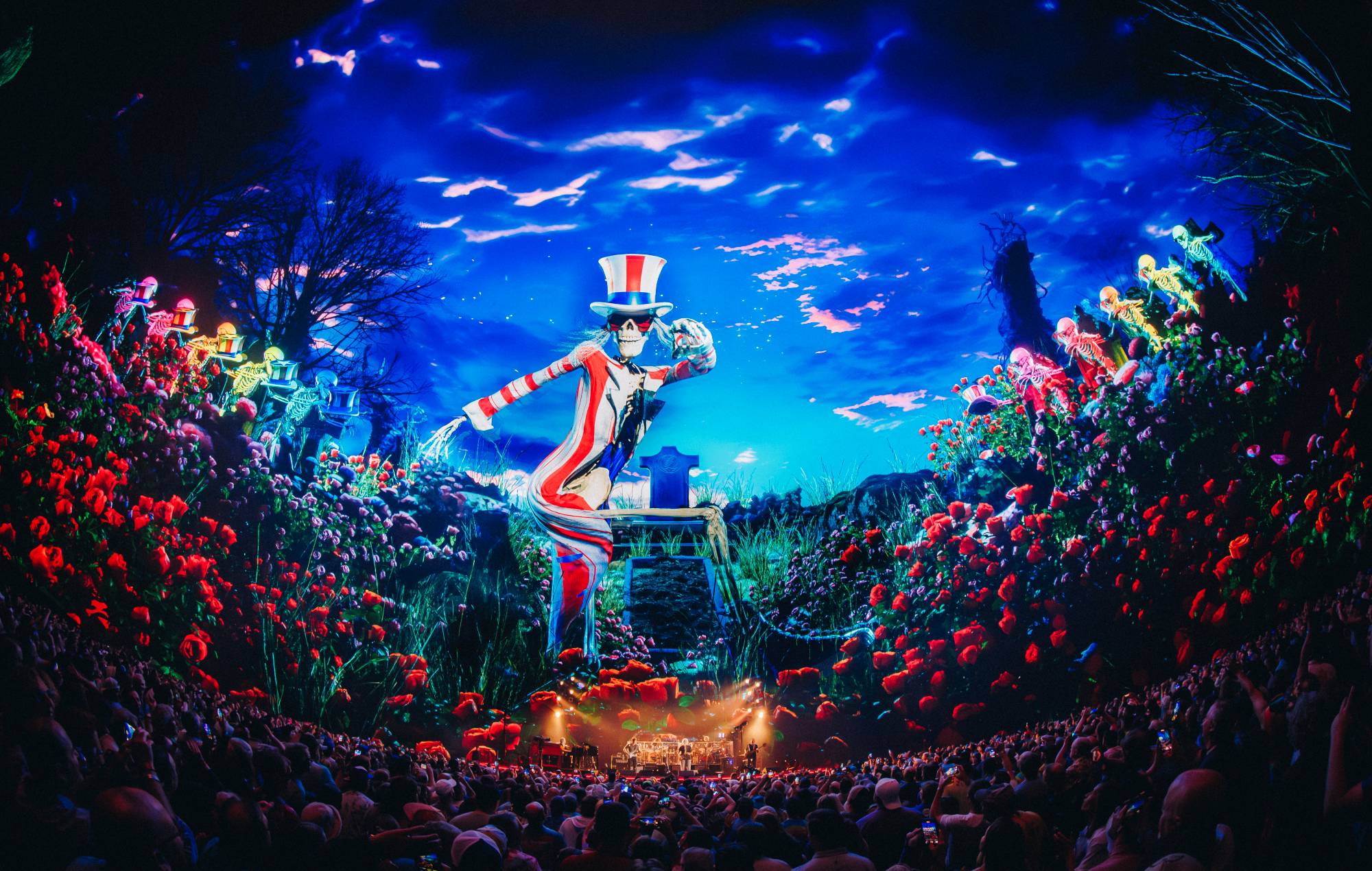 In a set that ran by way of 19 tracks and over three hours, the band made use of the state-of-the-art expertise within the venue to mission acquainted imagery and characters from the Grateful Lifeless’s historical past onto the enormous LED screens, together with the cranium and roses and the dancing bears.